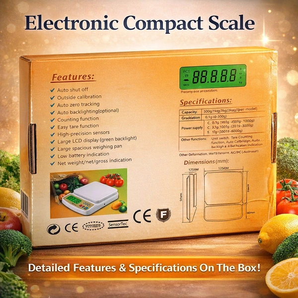 Featuring a clear LCD display with green backlight, this scale ensures easy readability even in low-light conditions. The high-precision sensors provide accurate measurements, while functions like tare, auto-zero tracking, and counting mode make it highly efficient for everyday use.