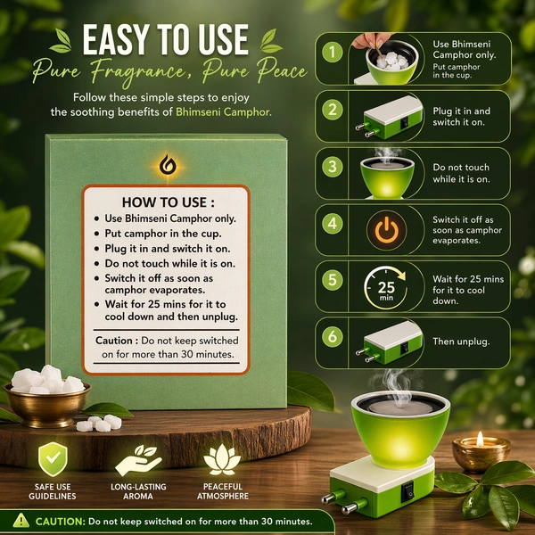 ā Easy to Use – Just add Bhimseni camphor, plug in, and enjoy fragrance within minutes