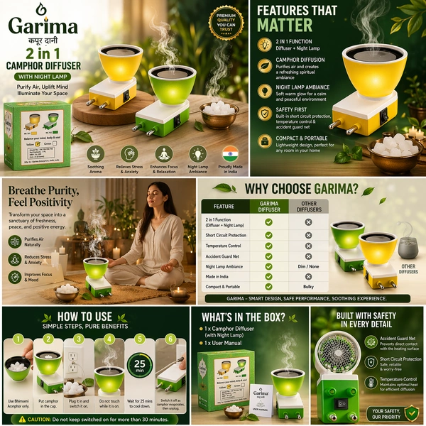 Garima 2-in-1 Camphor Diffuser with Night Lamp | Electric Kapoor Dani | Bhimseni Camphor Burner | Aroma Diffuser for Home, Office & Pooja Room | Safe & Compact