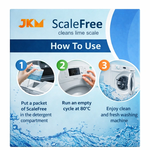 Keep your appliances running like new with JKM Scale Free cleans lime scale Powder. Specially formulated to remove tough limescale deposits, this powerful cleaner enhances the efficiency and lifespan of your washing machines and dishwashers.