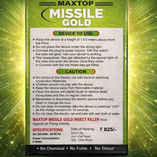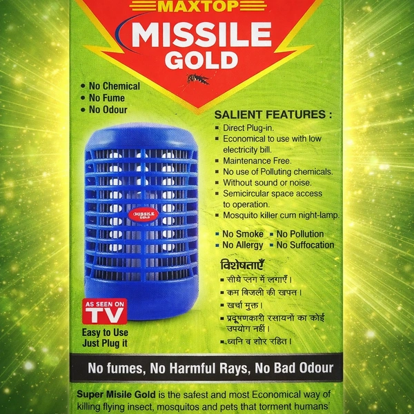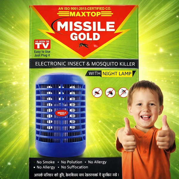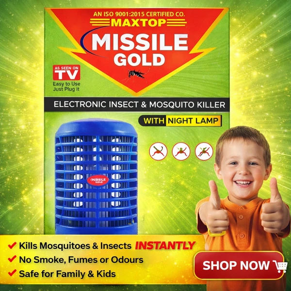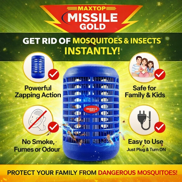 Protect your home and family from mosquitoes and flying insects with the MAXTOP Missile Gold Electronic Insect Killer Lamp. Designed with advanced electric zap technology, this device attracts insects using light and eliminates them instantly—without using any harmful chemicals.