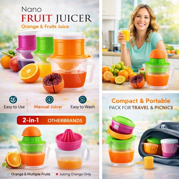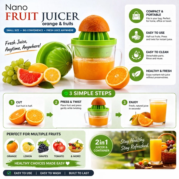 Enjoy fresh, healthy juice anytime with the Nano Fruit Juicer – 2-in-1 Manual Juicer & Container. Designed for convenience and performance, this compact juicer helps you extract maximum juice from oranges, lemons, grapes, tomatoes, and more — without electricity.