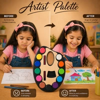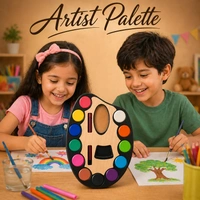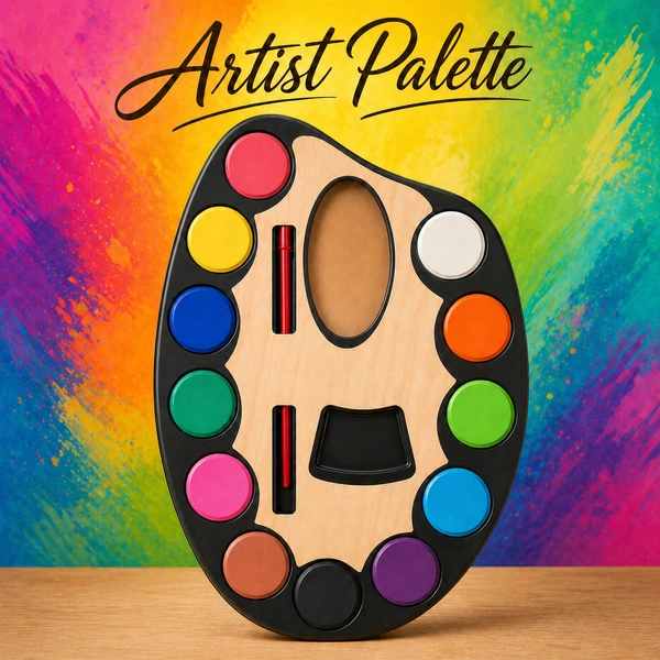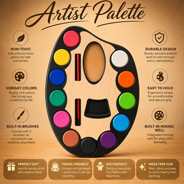 Unleash creativity with the Jades Artist Palette Water Colour Set, designed especially for kids, beginners, and hobby artists. This all-in-one painting kit features a beautifully designed wooden palette with 12 bright and smooth watercolours arranged around it for easy access. The ergonomic palette shape includes a thumb hole for comfortable holding, making painting fun and mess-free.