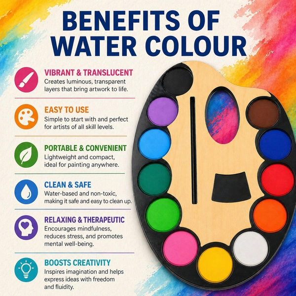 Unleash creativity with this all-in-one Artist Palette Water Colour Set, specially designed for kids, students, and beginners. Featuring 12 bright and vibrant colours arranged in a convenient palette shape, this set includes a built-in mixing area for easy blending.