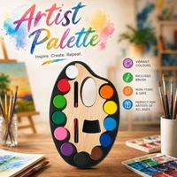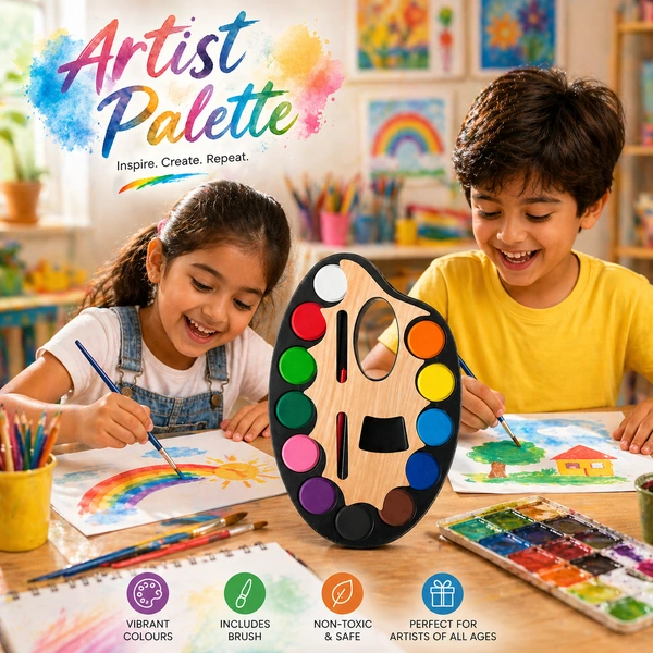 Artist Palette Watercolor Paint Set with Brush – 12 Vibrant Colors (Small) Size | Wooden Palette Design | Kids Painting Kit | Non-Toxic Art Supplies for School & Hobby - 1 Piece
