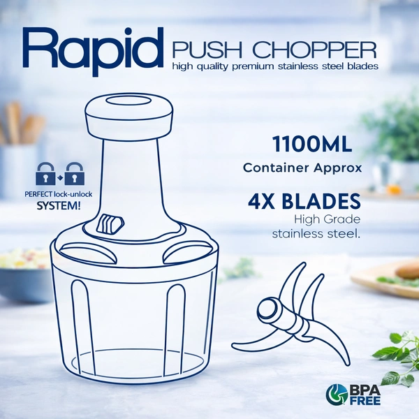 Rapid Push Chopper 1100ml | Manual Vegetable & Fruit Cutter | 4 Stainless Steel Blades | BPA-Free Container | Multipurpose Kitchen Chopper for Onion, Tomato, Nuts & Salad