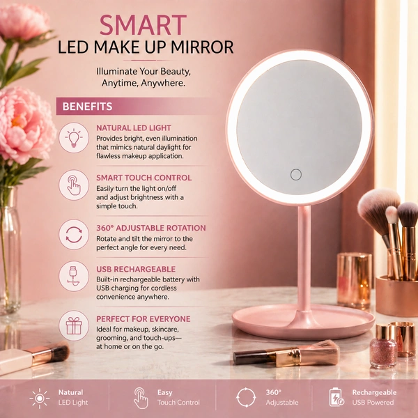 Enhance your beauty routine with this stylish and compact Smart Makeup Mirror. Designed for convenience and precision, this mirror features a sleek modern look with a stable stand, making it perfect for your dressing table, bedroom, or travel use. The soft illumination ensures clear visibility, helping you achieve flawless makeup every time. Lightweight and easy to carry, it’s an ideal beauty companion for daily use.